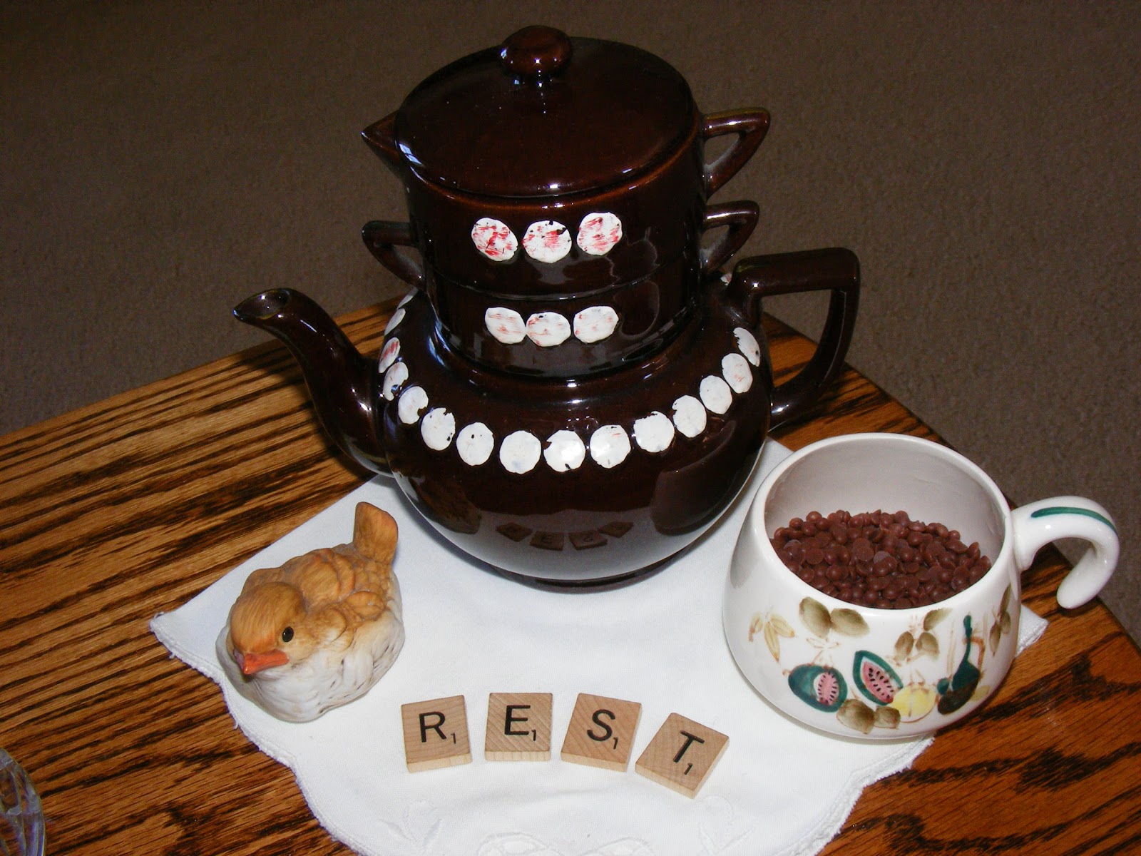 My antique Tea-For-One looks cozy with my favorite ceramic bird, antique coffee mug filled with roasted hazelnut soy beads, and Scrabble letters spelling R E S T. Ahhhhh. |
